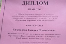28 января 2020 года в городе Набережные Челны прошел III Республиканский конкурс для педагогов дополнительного образования социально педагогической направленности с детьми с ОВЗ (ДПИ) «Мастерская творчества, идей и вдохновения». Арсланова Разалия Раисовна показала мастер – класс «Изготовления самолета из пенопласта МИ-4» и получила диплом I степени в номинации декоративное изделие. Галаванова Татьяна Прокопьевна показала мастер – класс «Изготовления самолета из пенопласта УТ-2» и получила диплом III степени в номинации оригинальный жанр. Поздравляем!