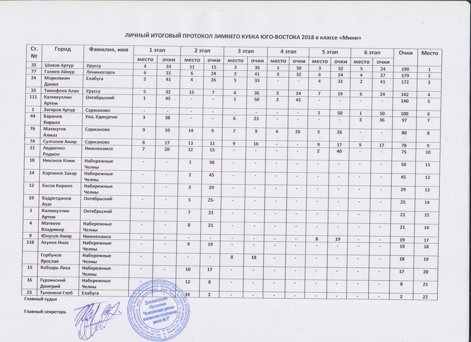 Личный итоговый протокол зимнего кубка Юго - Востока РТ 2018 в классе "Мини"