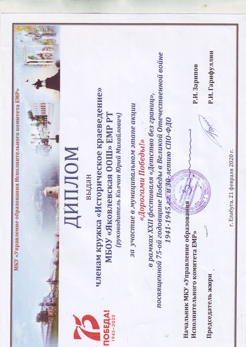 "Лучшая музейная экспозиция" муниципальный конкурс посвященном 75-ой годовщине Победы в Великой Отечественной войне. 1 место