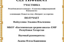 Ученица 9 класса Файзуллина Эльвина получила сертификат за участие в Республиканском конкурсе "Галактика информационной безопасности " в номинации "Плакат" на тему "Интернет: за и против". Научный руководитель Акаева Ф.К.\9нчы сыйныф укучысы Фәйзуллина Эльвина "интернет: өчен һәм каршы" темасына "Плакат" номинациясендә "мәгълүмати куркынычсызлык галактикасы"республика конкурсында сертификат алды.Фәнни җитәкче Акаева Ф.К.