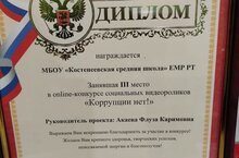 Диплом за 3 место в online- конкурсе социальных видеороликов "Коррупции нет!".Руководитель Акаева Ф.К./"Коррупция юк!" социаль видеороликлар конкурсында Онлайн - 3 урын өчен диплом".Җитәкчесе Акаева Ф. К.