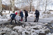 В школе прошёл весенний субботник.Ученики и учителя раскидали снег на территории школы, убрали мусор\Мәктәптә язгы өмә үткәрелде.Мәктәп укучылары һәм укытучылары мәктәп территориясендә кар өеп, чүп-чар җыйдылар.