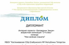 В рамках проекта г. Ярославль " ЗАПОВЕДНИК ЗЕМЛЯ 2017"ученики начальных классов в составе команды "Моя зеленая планета" под руководством Тарабукиной М.П. принимали участие с ребятами в разных номинация: Акция "Эко Реклама",Акция "Книга добрых дел",Конкурс изобретений "Мой подарок планете",Онлайн-викторина и получили:1)Сертификат 2)Благодарственное письмо 3)Диплом(Дипломант)Поздравляем!