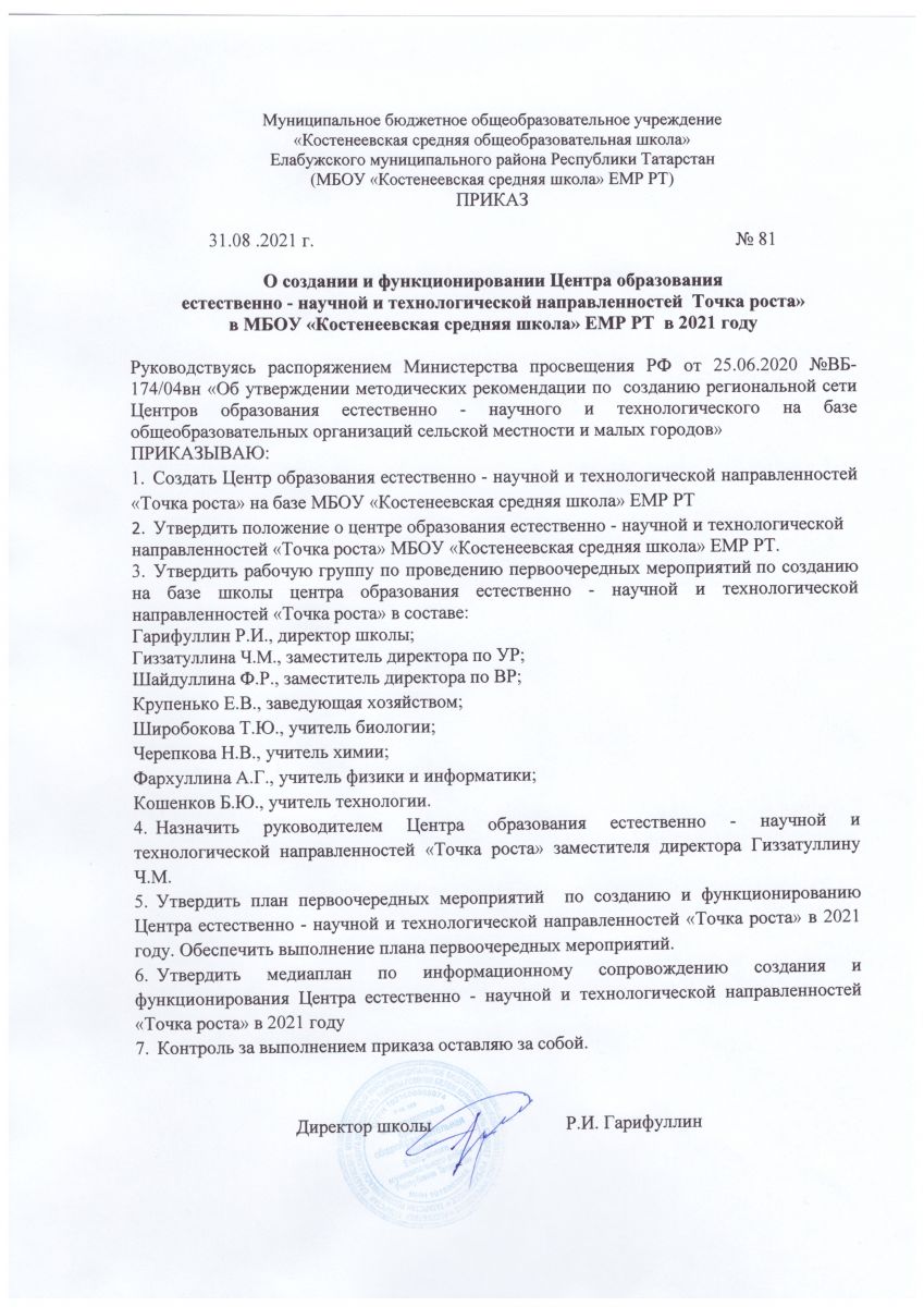 Приказ о создании и функционировании Центра образования естественно-научной и технологической направленностей" ТОЧКА РОСТА"