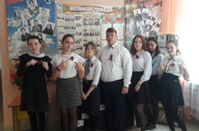 В школе все учащиеся с желанием участвуют в акции «Георгиевская ленточка». Эта лента черно-оранжевого цвета является одним из главных атрибутов Дня Победы в Великой Отечественной войне – одного из наиболее уважаемых праздников в нашей стране./ Мәктәптә барлык укучылар да «Георгий тасмасы» акциясендә теләп катнашалар. Кара-кызгылт сары төстәге әлеге тасма Бөек Ватан сугышында Җиңү көненең төп атрибутларыннан берсе - илебездә иң хөрмәтле бәйрәмнәрнең берсе.