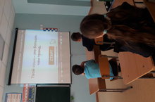 В честь 135 - летия со дня рождения Габдуллы Тукая ученики смотрят мультфильмы, созданные по его стихотворениям. / Габдулла Тукайның тууына 135- еллыгы уңаеннан укучылар аның шигырьләренә ясалган мультфильмнар карыйлар.