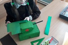 Учащиеся и на уроках технологии, и дома с родителями делают поделки своими руками на военную тематику, посвященные 75-летию Победы в Великой Отечественной войне 1941-1945 годов. Военная тематика — очень обширна. Однако, у всех учащихся уже есть сформированные представления — это мощная техника: танки, самолеты; открытки; выжигание на доске и т.д. / Укучылар технология дәресләрендә дә, ата-аналар белән дә 1941-1945 еллардагы Бөек Ватан сугышында Җиңүнең 75 еллыгына багышланган хәрби тематикага үз куллары белән кул эшләре ясыйлар. Хәрби тематика - бик киң. Бу куәтле техника: танклар, самолетлар, открыткалар, тактада яндыру эшләре. -