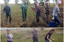 Сегодня в школе прошел очередной субботник, на который вышел весь коллектив школы. Мы сделали уборку территории школы, а также выкопали картофель на пришкольном участке. Поработали дружно и весело! / Бүген мәктәптә өмә узды, анда бөтен мәктәп коллективы катнашты. Бәрәңгене казып алдык, мәктәп тирә янын җыештырдык. Бик күңелле эшләдек!