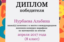 Нурбаеву Альбину, ученицу 8 класса, с победой в международном весеннем конкурсе-марафоне по математике по итогам апреля 2017 года. -