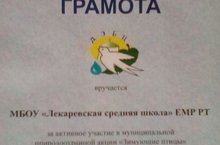Наша школа награждена грамотой за активное участие в муниципальной природоохранной акции «Зимующие птицы». Благодарим всех учеников, учителей и родителей за участие в данной акции! -
