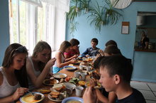 Сегодня, 16 июня в лагере день начался, как обычно, с утренней зарядки. На улице шел дождь, но мы время зря не теряли, устроили комический футбол.