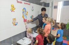 15 октября в детском саду Радуга состоялось беседа на тему "Всемирный день чистых рук". Во время беседы воспитатель предлагает детям отгадать загадку о предмете, который помогает бороться с микробами - мыле. В ходе беседы подчеркивается важность использования воды и мыла для достижения максимальной чистоты. Затем дети вместе с воспитателем отправляются в туалетную комнату, где воспитатель демонстрирует алгоритм правильного мытья рук, используя наглядный плакат. Дети повторяют движения за воспитателем, закрепляя знания о последовательности действий/ 15 октябрь көнне Радуга балалар бакчасында "Бөтендөнья Чиста куллар көне" темасына әңгәмә булды. Әңгәмә вакытында тәрбияче балаларга микроблар - сабын белән көрәшергә ярдәм итә торган предмет турындагы табышмакны чишәргә тәкъдим итә. Әңгәмә барышында максималь чисталыкка ирешү өчен су һәм сабын куллануның мөһимлегенә басым ясала. Аннары балалар тәрбияче белән бергә бәдрәф бүлмәсенә китә, анда тәрбияче күрсәтмә плакат кулланып, кулларны дөрес юу алгоритмын күрсәтә. Балалар тәрбияче артыннан хәрәкәтләрне кабатлыйлар, эш эзлеклелеге турында белемнәрен ныгыталар.
