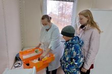 Сегодня учащиеся школы были в гостях у фельдшера с.Лекарево. Интересовались желтым чемоданчиком у фельдшера. Фельдшер Ольга Андреевна рассказала и показала этот чемоданчик. Кроме лекарств в ампулах, как правило в укладке есть перевязочный материал, жгуты, шприцы, катетеры, перчатки, инструменты и т.д./ Бүген мәктәп укучылары Лекарево авылы фельдшерында кунакта булдылар. Фельдшерда сары чемоданчик белән кызыксындылар. Фельдшер Ольга Андреевна бу чемодан турында сөйләде һәм күрсәтте. Ампулалы дарулардан тыш, җәюдә бәйләү материалы, жгутлар, шприцлар, катетерлар, перчаткалар, инструментлар һ. б. бар.