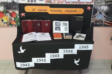 На втором этаже школы оформлена книжная выставка «И книга память оживит...», посвященная 75-летию Победы в Великой Отечественной войне 1941-1945г. / Мәктәпнең икенче катында ,1941-1945 еллардагы Бөек Ватан сугышында Җиңүнең 75 еллыгына багышланган «Китап та җанландырачак...» дип исемләнгән китап күргәзмәсе оетырылды. -