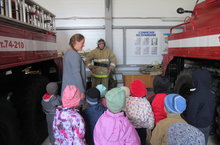 Балаларга янгын сүндерү машиналарын, аларның ничек эшләүләрен, нәрсә белән җиһазланганнарын сөйләделәр һәм күрсәттеләр.Балалар зур кызыксынучанлык белән янгын сүндерү машиналарын карадылар, машиналарга утыру бәхетенә дә ирештеләр. Балалар янгын сүндерүчены игътибар белән тыңладылар. Алар бу экскурсиядән янгын сүндерүче профессиясе турында бик күп яңа белемнәр алып кайттылар. Ребятам показали имеющиеся в распоряжении пожарные автомобили. Дети с большим интересом исследовали пожарные машины, некоторым ребятам выпала возможность посидеть в кабине.Удивлению ребят не было предела, оказывается, пожарная машина таит в себе большой арсенал для тушения возгораний. Дети многое узнали о профессии пожарного, о том, с какими трудностями они сталкиваются и какими смелыми и отважными им приходится быть.