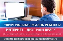 19.01.2018 с 12.00 до 13.30 состоится Республиканское родительское интернет-собрание «Виртуальная жизнь ребенка: интернет – друг или враг?». Он-лайн трансляция собрания будет вестись на сайте Казанского инновационного университета имени В.Г.Тимирясова по адресу: https://ieml.ru/. -
