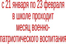 Месячник военно-патриотического воспитания в школе, посвященный Дню защитников Отечества и проводимый в нашей школе ежегодно, ориентирован на учащихся 1-11 классов. Месячник проводится насыщенно, разнообразно. Он включает в себя тематические классные часы,различные соревнования, экскурсии в музей, конкурс рисунков, сочинений. Все эти мероприятия очень важны для поколения, не знавшего войны, каждое соприкосновение с живой историей, каждый рассказ о славных страницах нашего государства наполнен особым смыслом, что во многом способствует гражданскому и нравственному становлению личности.
