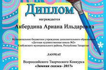 Поздравляем победителей Всероссийского творческого конкурса "Зимняя сказка - 2017" (преподаватель Васильева Наталия Владимировна): Акбердину Ариану, Гимадиеву Дарью, Карманову Альбину, Мирзаянову Карину, Саттарову Алсу, Часовскую Ангелину, Шнайдер Дарью.