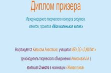 Поздравляем Казакову Анастасию учащуюся 3 б класса (преподаватель Аммосова Марина Александровна) с победой в конкурсе.