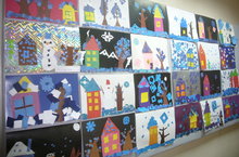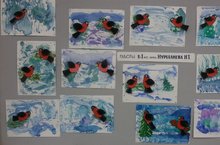 Только зимнею порой...Снегири слетелись на выставку работ Б1 класса. (преподаватель Нургалиева Нателла Талатовна). Работы выполнены в смешанной технике, на нарисованную веточки приклеены снегири сделанные в технике бумагопластика.