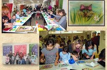 Здесь же развернулся мастер-класс по живописи шерстью, который вела преподаватель детской художественной школы № 2 Марина Александровна Аммосова. Умело и доходчиво объясняя своим маленьким и взрослым подопечным приёмы и последовательность работы, она уже через час с небольшим провожала их с готовыми панно формата А4, где на фоне неба выглядывала из травы мордочка симпатичного котика. А тем временем учащиеся ДХШ №2, под руководством преподавателя Романовой Р.М., приняли участие в мастер-классе по экзотичной технике эбру — живопись на воде. (источник информации - сайт ЕГМЗ)