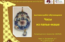 Папье-маше это легко поддающаяся формовке масса, получаемая из смеси волокнистых материалов (бумаги, картона) с клеящими веществами, крахмалом, гипсом и другими добавками. Из папье-маше делают муляжи, маски, учебные пособия, игрушки, театральную бутафорию, шкатулки. А ученики Детской художественной школы №2 создали оригинальные часы для интерьера. Приглашаем всех желающих на выставку интерьерных часов.