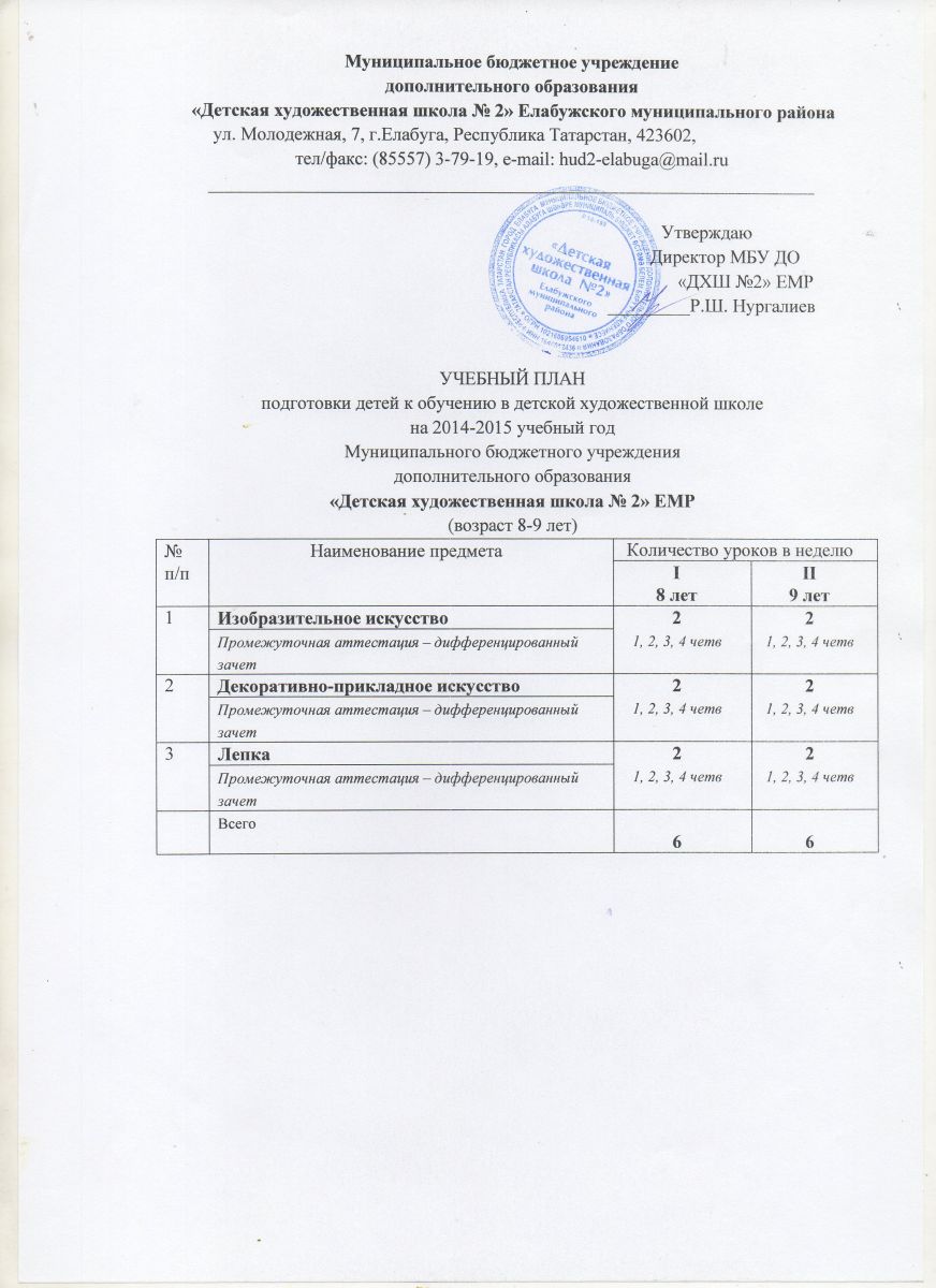 Учебный план подготовки детей к обучению в детской художественной школе 2014-2015г.