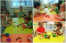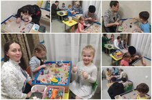 Воспитанники 2 группы "Улыбка" учатся развивать мелкую моторику через игру "Шнуровка", деревянными конструкторами и разными крупами.