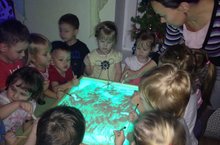 В 4 группе еженедельно проводится кружок «Сказки на песке». Целью кружка является – сохранение и укрепление психического здоровья детей. На занятиях воспитатель использует световой стол для рисования. Такие занятия помогают снять психофизического напряжения, развить тактильно – кинестетическую чувствительность, развить мелкую моторику. На фото занятие группы 2 раннего возраста «Снежинки на песке».