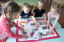 В рамках подготовки празднования 75 годовщины ВОВ в детском саду педагоги совместно с детьми и родителями изготавливают пособия и другие коллективные работы. Так в группе №7 был оформлен фотостенд «На полях сражений». Дети с увлечением помогали воспитателю, узнали много интересного о ВОВ. Таким образом, через различные формы работы происходит формирование у детей чувства гордости, уважения к защитникам Родины, к старшему поколению, подарившего мирное небо над головой!