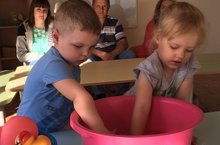 В младшей группе №2 прошло занятие в рамках Дня открытых дверей, с целью формирования у детей представления о свойствах воды. Дети узнал, что водичка льется, она может быть холодной, теплой или горячей, предметы могут в ней плавать или тонуть, вода прозрачная, мы сами можем менять цвет воды.