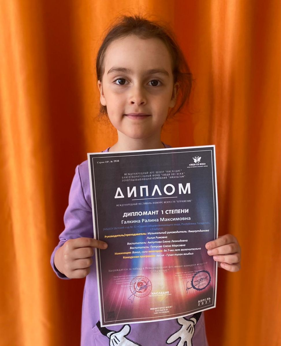 Безнең тәрбияләнүчебез Галкина Ралина «чагылыш»халыкара сәнгать фестиваль-конкурсында I дәрәҗә дипломга лаек булды. Аңа үз җиңүләре белән горурланырга һәм барысын да үзләренең могҗизалы иҗаты белән шаккатырырга телибез.
