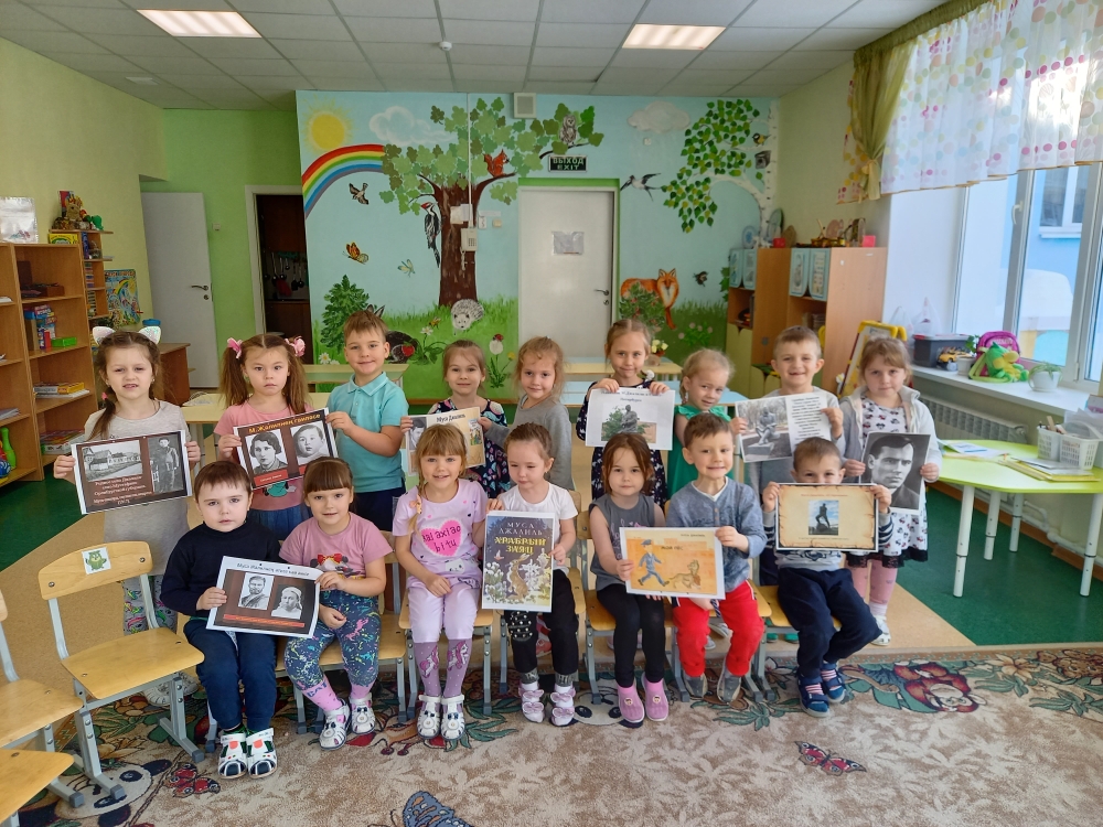 Бүген 13 нче урта төркем балалары шагыйрь һәм Советлар Союзы Герое Муса Җәлил Мостафа улының биографиясе һәм әсәрләре белән таныштылар. Әңгәмә барышында шагыйрьнең гаиләсе турында, кайда туганын белделәр. Санкт-Петербургта, Оренбургта һәм Казанда урнаштырылган, шагыйрьгә багышланган, һәйкәлләрнең иллюстрацияләрен карадылар. Галиева Инзилә "Куян" шигырен сөйләде, Мусина Илина "Минем җырым" шигыре белән таныштырды.