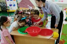 Без буген балалар белән карның төсен билгеләдек. Аннары һәр бала карны алып, аның уч төбендә ничек эреп, суга әверелүен күзәтте. Шулай итеп, без карның салкын, ә уч төбенең җылы булуын, шуңа күрә карның эрүен ачыкладык.Воспитател: Набиева А.М.