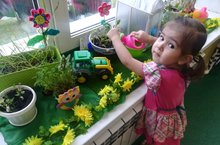 Мәктәпкәчә яшьтәге балалар табигатькә һәм табигый күренешләргә карата уңай хисләр салалар, үсемлекләр дөньясының гаҗәеп күптөрлелеген ачалар, табигатьнең кеше тормышындагы ролен беренче тапкыр аңлыйлар. Без балалар белән яз башында "тәрәзә төбендә бакча" булдырдык. Балалар белэн суган, укроп, редиска,кыяр, борчак утырттык. Балаларга аларны карау һәм күзәтү бик ошый. Шулай итеп, без табигатьнең экологик кыйммәтләрен үстерәбез, әйләнә-тирә дөнья турында сүз һәм күзаллауларны баетабыз.