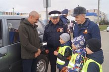 Воспитанники нашего детского сада поздравляли ветеранов и водителей с наступающим Днем Победы и вручали символ Великой Победы - георгиевскую ленточку, а сотрудники госавтоинспекции совместно с начальником ГИБДД Елабужского района Анасом Гаффаровым призывали участников дорожного движения строго соблюдать Правила дорожного движения, желали хорошего настроения и безаварийных дорог.