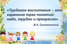 Хезмәт тәрбияләү һәр бала өчен эш сөючәнлек һәм хезмәт күнекмәләрен формалаштыру системасы булып тора. Эш белән тәрбияләүнең төп максаты булып, балаларны хезмәтнең һәр төренә сакчыл караш формалаштыру тора. Шуңа күрә балалар мәйданчыкта ооылырга теләп ярдшм итәләр.
