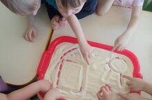 Воспитанники нашего детского сада познакомились с техникой рисования с помощью манной крупы .Малыши на подносе с крупой пальцами, ладонями увлеченно рисовали различные узоры: солнышко, цветочки, яблоко, мячик и многое другое.