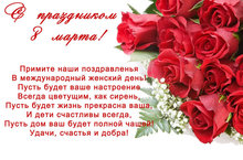Поздравляем Вас с этим прекрасным днем — с Днем 8 марта! Хочется пожелать побольше нежности и чистоты, чтобы в душе всегда была теплота.