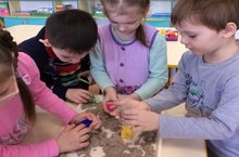 В рамках экспериментальной деятельности дети 4 группы с удовольствием ставили опыты и эксперименты с кварцевым и кинетическим песком, рисовали на поверхности , лепили причудливые формы, искали клад, играли со штампами, находили сходство и отличия между ними.