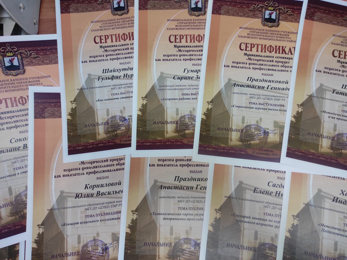 2022 елның 27 сентябрендә балалар техник иҗат үзәгендә "Һөнәри осталык күрсәткече буларак өстәмә белем бирү педагогының методик продукты"дигән муниципаль семинар узды.