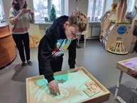 Библио-пескотерапия 11.01.2024 Воспитанники детского дома посетили Центральную детскую библиотеку. Для них была проведена экскурсия по обновлённому зданию.На практическом занятии "Узоры зимы" рисовали по песку,где проявили свои художественные способности.Увлекательная викторина по сказкам детям очень понравилась,они с удовольствием приняли участие. Балалар йортында тәрбияләнүчеләр Үзәк балалар китапханәсендә булдылар. Алар өчен яңартылган бина буенча экскурсия үткәрелде.Практик дәрестә "Кыш үрнәкләре" н ком буйлап рәсем ясыйлар,анда үзләренең сәнгать сәләтләрен күрсәтәләр.Балаларга әкиятләр буенча кызыклы викторина бик ошады, алар бик теләп катнаштылар.