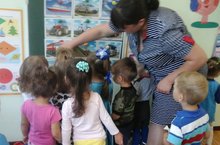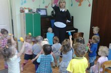 Каждое музыкальное занятие у детей начинается с музыкального приветствия под шумовые музыкальные инструменты-маракас. ложки, погремушка. Дети пропевают песенку, здороваясь после каждого куплета, очень любят пальчиковые игры\Һәр музыкаль дәрес балаларда музыка уен кораллары-маракас музыкаль сәламләү белән башлана. кашыклар, йокымсырак. Балалар җыр җырладылар, һәр куплеттан соң сәламәт булып, бармак уеннарын бик яраталар.