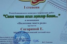 Диплом I степени в Республиканском конкурсе творческих работ "Сөлге чигән асыл җепләр белән..." 05.04.2018