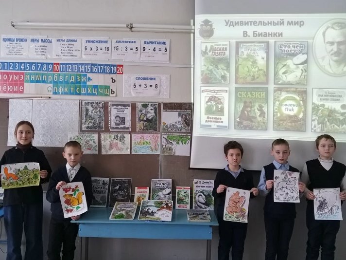 11 февраля исполняется 132 года со дня рождения одного из любимых детских писателей, автора более трехсот произведений о жизни мира животных- В. В. Бианки. В начальных классах прошла интеллектуальная игра по произведения Бианки. В конце игры ребята нарисовали героев его рассказов.