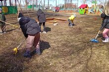Территориябездә карлар эреп бетте. Тырмалар алып тырмаларга чыктык./Ощищаем территорию.