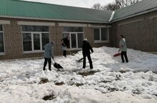 Балалар бакчасы кырыенда калган карларны таратып, тизрәк эрергә булышабыз./Помогаем снегу растаить быстрее.