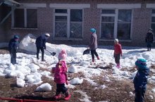 Бакчабыз кырыйларында карлар эреп бетмәде әле. Балалар белән берлектә күмәкләшеп карларны тараттык. Кечкенәдән шулай эшләргә өйрәнеп үсәбез.