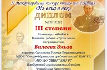 Во II Международном конкурсе чтецов имени Габдуллы Тукая "От века к веку". Валеева Эльза награждена дипломом III степени, исполнив песню "Туган авыл". Поздравляем!