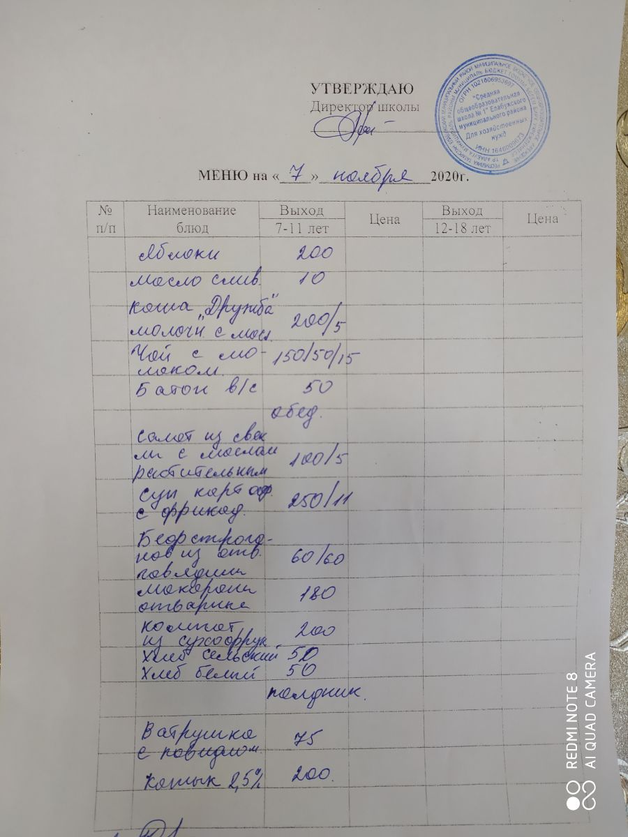 Меню пришкольного лагеря на 07.11.2020 07.11.2020